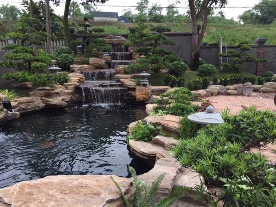 Hồ cá koi lúc về đêm sẽ khiến nhiều người ngạc nhiên bởi vẻ đẹp được nâng tầm khi kết hợp với hệ thống ánh sáng lung linh, huyền ảo. Và một yếu tố nữa giúp công trình thêm phần nổi bật là cách trang trí xung quanh hồ cá rất bắt mắt. Con đường dẫn đến hồ được trải sỏi và lát đá bazan sạch sẽ, chắc chắn. Một điểm nhấn của dự án ở góc trong của hồ là mẫu hòn non bộ cỡ nhỏ với dòng thác nước nối tiếp nhau. Thác nước này có nhiệm vụ tuần hoàn nước cho hồ cá và tạo nên âm thanh sống động, khá vui tai. Ngoài ra vẻ đẹp lấp lánh huyền ảo phản chiếu dưới hồ được từ 2 chiếc đèn đá khiến chúng ta cũng không thể rời mắt khỏi không gian này.
